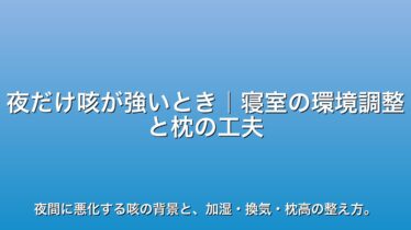 症状ケア 夜だけ咳が強いとき|寝室の環境調整と枕の工夫 夜間に咳が悪化する理由は、副交感神経の働きや横になることで鼻水が流れ込むため。寝室の湿度を50〜60%に保ち、上体をやや高くする工夫で楽になることも。 2025.11.03 症状ケア