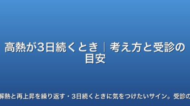 症状ケア 高熱が3日続くとき|考え方と受診の目安 高熱が3日続くときの受診の目安を解説。朝下がって夜上がる熱の繰り返しは子どもによくあるパターン。水分摂取・睡眠・反応など観察ポイントと、すぐ受診すべきケースをわかりやすく。 2025.10.30 症状ケア